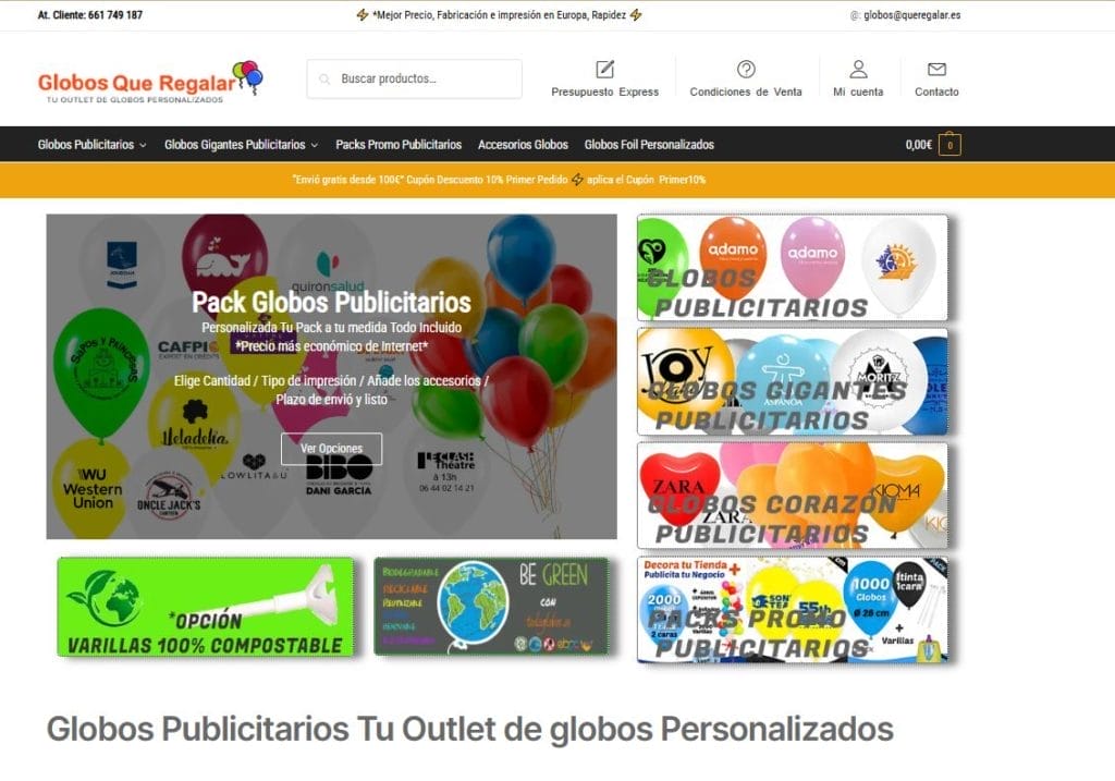 Globos.queregalar.es es tu outlet de globos personalizados con la mejor relación calidad-precio. Se especializan en globos publicitarios, ofreciendo desde packs económicos de globos de látex biodegradables hasta globos gigantes para eventos. Destacan por su experiencia en globos de de látex 100% látex natural.